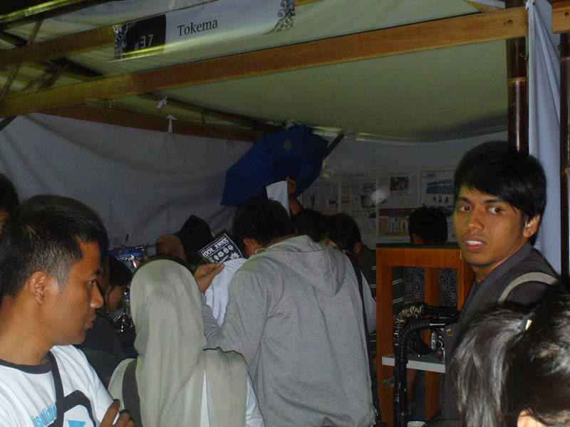Seiring berjalannya waktu, pengunjung yang datang pun semakin ramai. Mau jalan saja susah. Kemacetan di mana-mana. Banyak orang tiba-tiba berhenti untuk bertransaksi di stan-stan yang ada di Pasar Seni ITB 2010. Suasananya memang sudah kayak pasar saja… (Ya elah… namanya juga “Pasar” Seni :p). Teman-teman di stan TOKEMA pun sudah mulai tampak sibuk melayani pembeli. Mencarikan kaos ukuran yang cocok, mengambil stok lagi dari gudang, menyiapkan uang kembalian, dll.