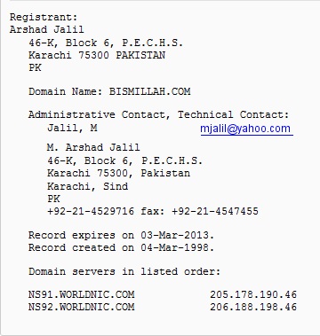 Pasti penasaran kan siapa yang membuat layanan email bismillah.com. Dengan mencoba menelusuri domain tersebut melalui http://whois.domaintools.com/bismillah.com didapatkan informasi pemilik domain tersebut sebagai berikut: