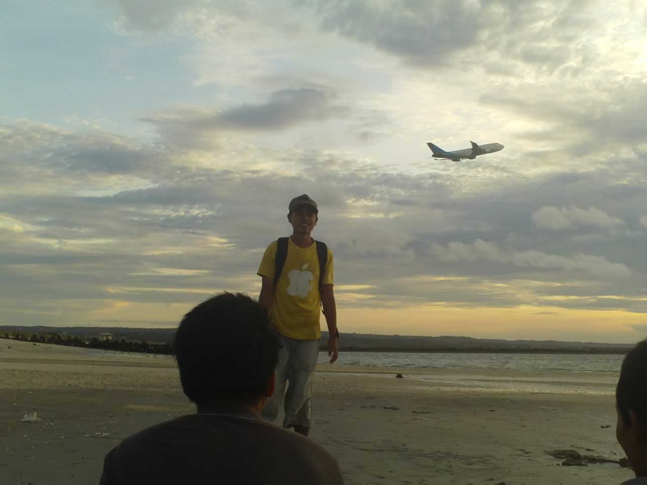 Dari kawasan hotel-hotel itu perjalanan dilanjutkan lagi ke selatan sampai akhirnya mentok di pagar besi yang melintang dari barat ke arah timur. Ternyata itu adalah kawasan bandara I Gusti Ngurah Rai yang berbatasan dengan pantai Kuta. Berkali-kali tampak berbagai jenis pesawat dari mancanegara lepas landas dari landasan yang sebenarnya berada di pantai itu. aku sempat mencoba mengambil foto sekali ke arah bandara dari balik pagar-pagar besi itu, tapi ditegur oleh petugas keamanan di sana. Hihihi… 😀