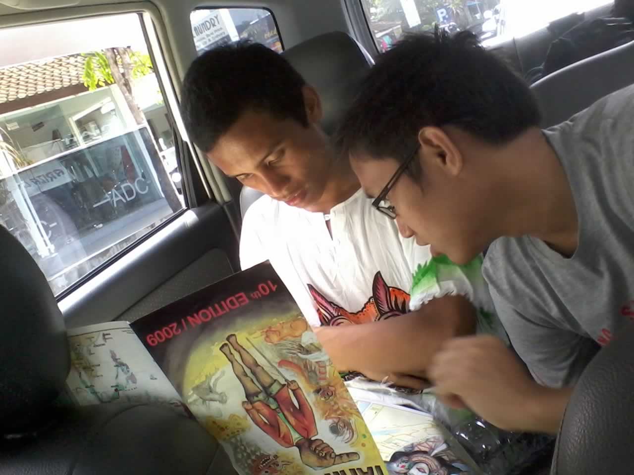 Tak mau hanya sekedar melihat dari dalam mobil, kami mencoba turun dan masuk ke salah satu galeri lukisan yang ada di sana yang kebetulan memiliki parkir yang luas. Sayang, aku lupa nama galeri itu. Begitu selesai parkir, kami beranjak masuk ke dalam galeri. Oh, ternyata dimintai tiket oleh penjaganya. Okelah kalau begitu kami akan membeli dulu. Tak lama kemudian mata kami terbelalak kaget. What?? Alamak, harga tiket masuknya Rp40.000!! “Itu sudah untuk empat orang ya?” dengan polosnya aku bertanya kepada petugas tiket itu. Tiba-tiba aku tersadar Rp40.000 yang tertulis di loket itu mana mungkin ditujukan untuk 4 orang. Akhirnya dengan malunya kami nggak jadi masuk. Kami pun ngeloyor pergi begitu saja tanpa menunggu komentar bapaknya. Hihihi… 😀