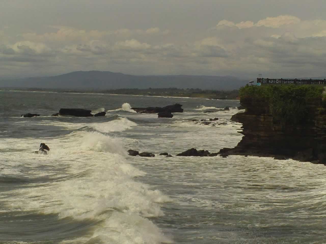 Hanya berbekal peta dan papan penunjuk jalan, kami sampai juga akhirnya di Tanah Lot. Alhamdulillah tidak sampai nyasar ke mana-mana. Tiket masuk ke Tanah Lot untuk 4 orang dengan mobil sebesar Rp 35 ribu. Tanah Lot merupakan objek wisata yang menawarkan keunikan karena adanya sebuah pura yang berada di atas bongkahan batu raksasa yang dipisahkan dengan daratan oleh laut. Sampai di sana kami berfoto-foto dulu. Kencang juga ya ombak di sana.