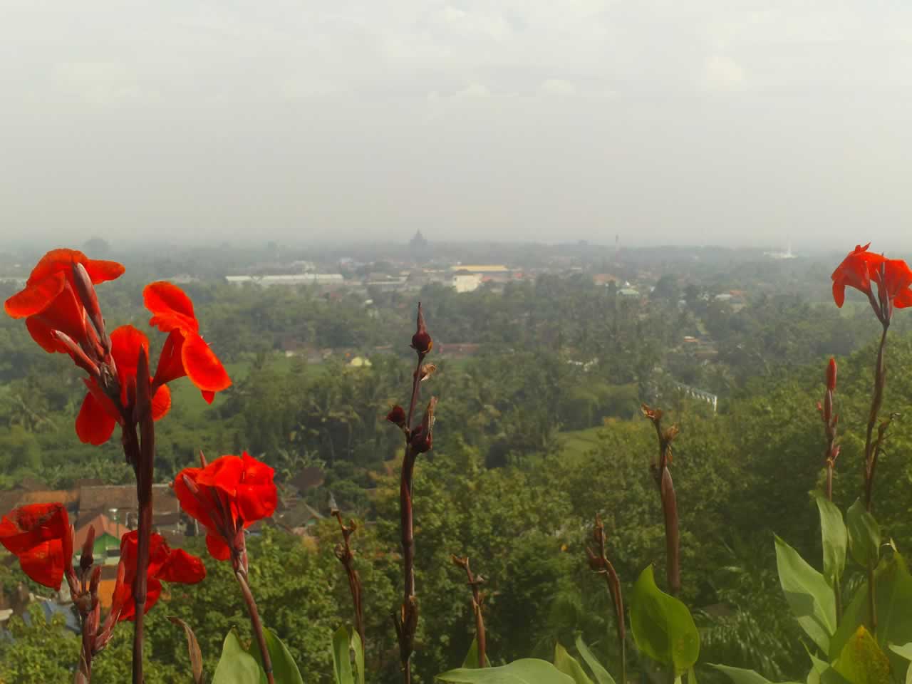 Begitu tiba di kompleks Situs Ratu Boko kami berjalan menuju plaza Andrawina (sebuah halaman dengan paving block yang luas) yang berada di dekat pintu masuk kompleks tersebut. Dari atas plaza tersebut kami bisa melihat pemandangan luas ke arah kompleks Candi Prambanan dan wilayah Jogjakarta. Aku membayangkan pasti pemandangan saat malam hari akan lebih indah dilihat dari atas sini karena akan terlihat gemerlap lampu di bawah sana. Dari atas plaza ini pula pengunjung sering menikmati datangnya sunrise atau sunset. Selain itu, ternyata tempat ini juga sering digunakan untuk pesta pernikahan lho.