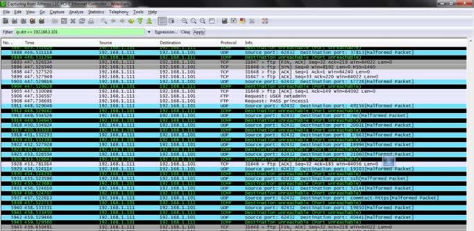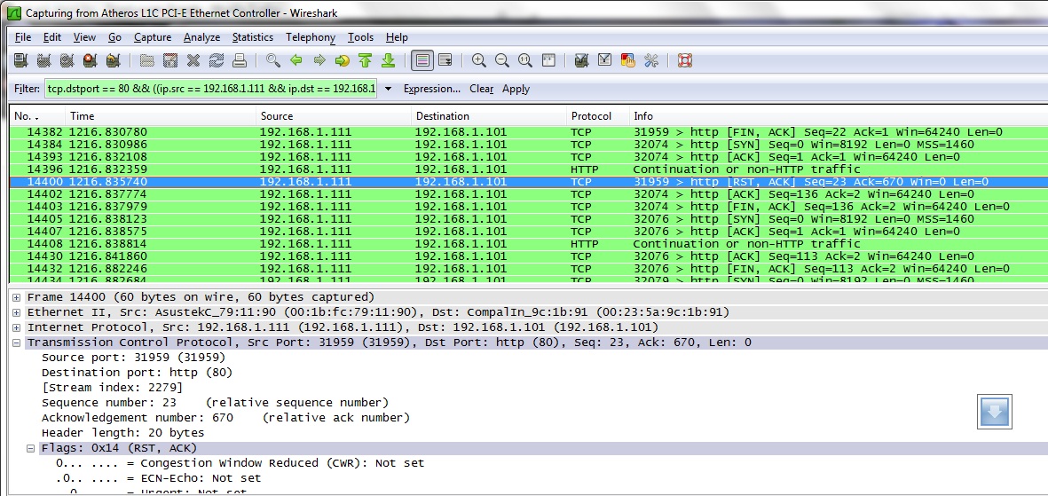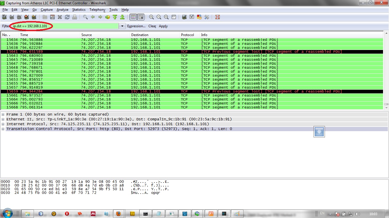 Oke, sekarang langkah pertama yang saya lakukan adalah menjalankan fungsi capture pada wireshark untuk menangkap paket yang keluar masuk melalui interface LAN saya. Kemudian, fungsi capture itu saya filter dengan ekspresi “ip.dst == 192.168.1.101” dengan tujuan untuk melihat paket yang masuk ke komputer saya saja.