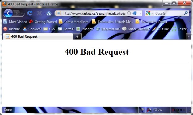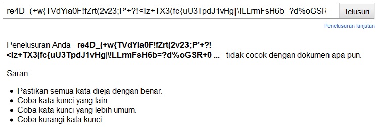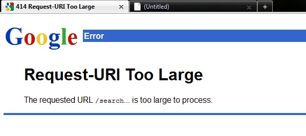 Kali ini Google sudah benar-benar tidak memproses query yang saya masukkan sepanjang 1500 karakter. Setelah saya coba kecilkan lagi, yakni sebesar 1000 karakter, ternyata Google tetap tidak memprosesnya. Pesan yang ditampilkannya adalah “Request-URI Too Large”.
