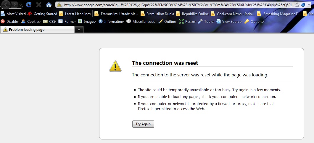 Terakhir, saya iseng mencoba memasukkan teks sepanjang 1000000 karakter ke dalam kotak pencarian Google. Ternyata pesan yang ditampilkan browser saya adalah “The connection was reset”. Tampaknya, jaringan saya tidak kuat dalam mengirimkan paket data sebesar itu. Akhirnya sampai terjadi time out seperti itu. Saya coba turunkan hingga 200.000 karakter ternyata memang hasilnya selalu itu. Sepertinya, memang masalah kapasitas pengirimannya yang terbatas.
