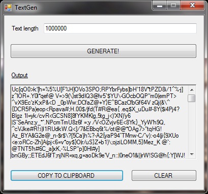 Oke, sekarang saya akan jelaskan satu persatu antarmuka aplikasi itu. Textbox yang berada di samping label “Text length” itu adalah untuk memasukkan panjang teks yang kita inginkan (jumlah karakter). Tombol “GENERATE!” jika diklik akan menghasilkan teks dengan panjang sesuai masukan pada textbox yang pertama saya sebutkan tadi dan akan ditampilkan dalam textarea yang berada di bawah label “Output“. Pada saat bersamaan, tombol “COPY TO CLIPBOARD” dan “CLEAR” akan aktif. Tombol “COPY TO CLIPBOARD” jika diklik, akan menyalin teks pada textarea ke dalam memori dan siap di-paste di tempat manapun. Sedangkan tombol “CLEAR” jika diklik, akan membersihkan textarea dari teks.