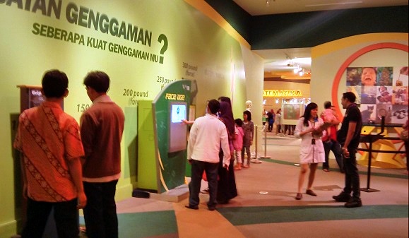 Sebagai orang yang berlatar belakang teknik — yang dahulu ketika masih tingkat satu pun kami mendapat kuliah Fisika Dasar dan Kalkulus — objek-objek sains di Science Center ini cukup menarik bagi kami. Ada alat untuk mengukur kekuatan genggaman tangan, harpa dengan senar laser yang bisa dimainkan layaknya harpa sungguhan, mesin elektrostatik Van De Graff, simulasi angin topan, dsb. Sebagian memang sudah pernah kulihat di Jatim Park (waktu SMP dulu), tapi di Trans Studio ini objek sainsnya lebih banyak — kebanyakan objek fisika. Cocok bangetlah buat pelajar-pelajar yang suka sama Fisika, hehe.