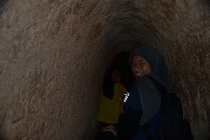 Setelah Bapak pemandu memberikan penjelasan, kami mencoba masuk ke dalam terowongan. Terowongan ini ternyata memiliki beberapa tingkat kedalaman. Aku tak ingat sampai tingkat berapa yang paling dalam. Namun, aku sempat menjajal turun hingga tingkat ketiga kalau tidak salah.