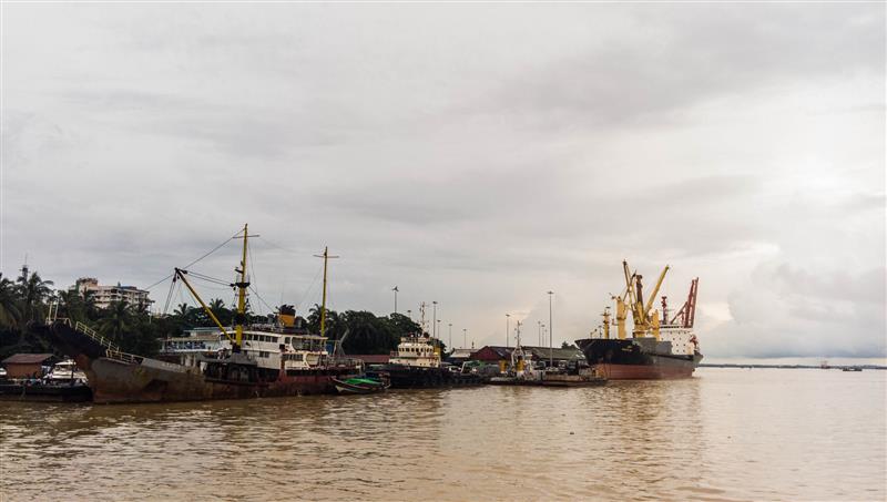 Beranjak dari Maha Bandoola Garden, kami berjalan kaki ke arah selatan. Mungkin hanya berjalan sekitar 1 km, kami sudah sampai di pelabuhan Yangon. Di seberang tampak sungai Yangon yang sangat lebar. Di seberang sungai ini masih termasuk wilayah administratif Yangon.