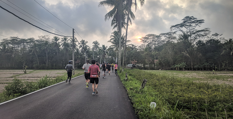 Tepat pukul 5 pagi para peserta Full Marathon pun memulai lari. 1 Kilometeran pertama lari masih di sekitaran halaman Taman Lumbini. Baru setelah itu keluar kompleks Candi Borobudur memasuki perkampungan dan areal persawahan.