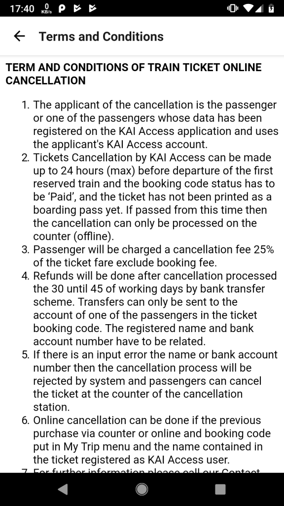Berbeda dengan proses pembatalan tiket di stasiun di mana penumpang memiliki opsi ambil tunai atau transfer, untuk pembatalan online dana refund hanya akan ditransfer saja. Tidak ada opsi ambil tunai.