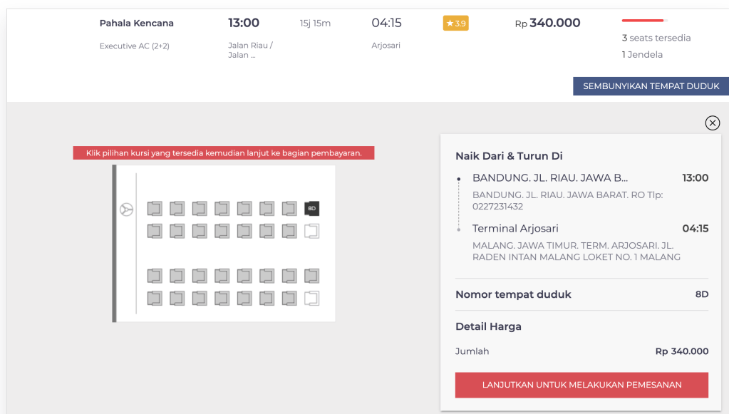 Saya pun iseng mencari di aplikasi bus lainnya, yakni RedBus. Ternyata PO. Pahala Kencana ada di daftar hasil pencarian. Masih ada 3 kursi lagi yang tersisa. Alhamdulillah, batin saya.