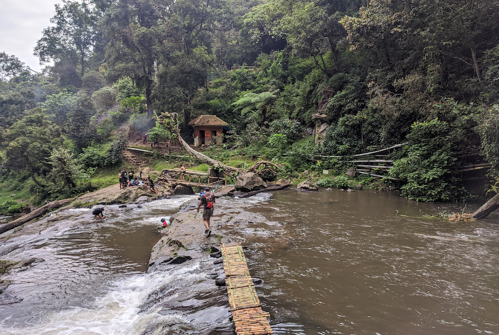Usai makan dan ngobrol-ngobrol, kami bersiap-siap untuk kembali pulang. Kami kembali ke trekking menuju Curug Layung dan menyeberangi sungai.