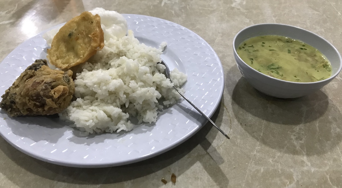 Dalam perjalanan kemarin menu yang saya dapatkan adalah nasi putih dengan ayam goreng tepung krispi dan soto ayam. Minumannya berupa es teh manis atau teh hangat. Bisa refill juga.