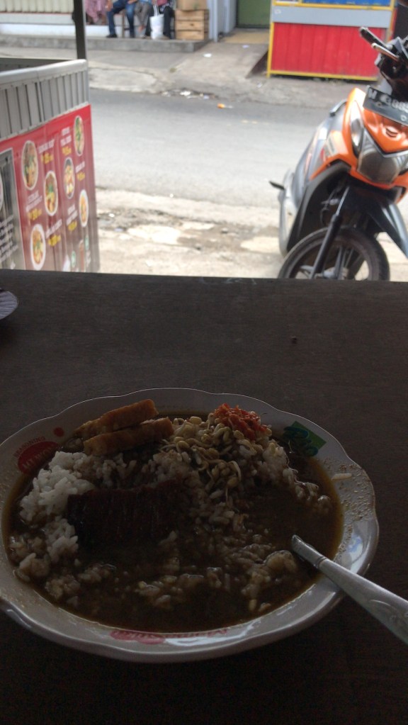 Di pertigaan Pasar Palang, saya mampir ke warung nasi rawon yang berada di pojokan pertigaan. Saya makan siang dulu di sana.