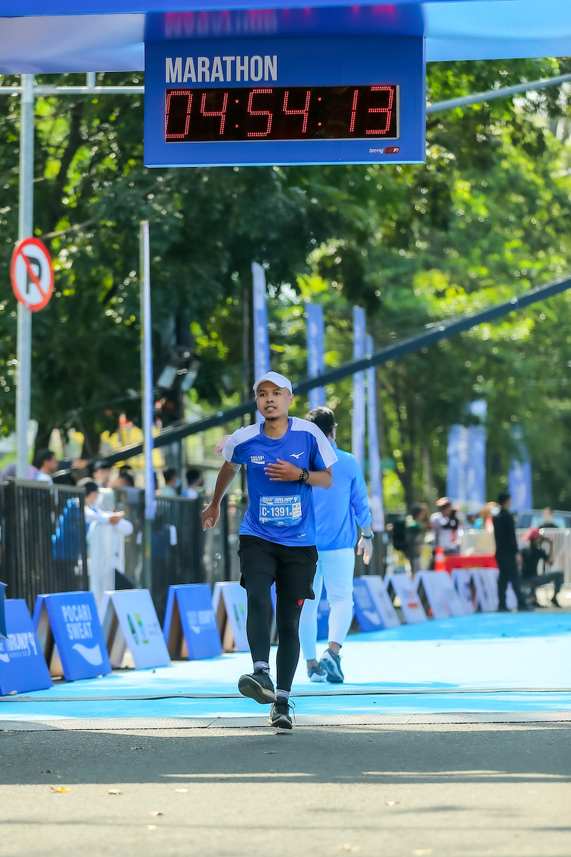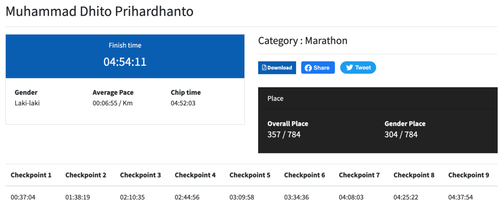 Saya tidak menyangka bisa finish di sub 5. Maklum, sebelum lari, saya agak pesimis bahkan untuk bisa finish sub 5:30 mengingat latihan saya yang cukup kurang. Saya juga sempat cemas akan dapat DNF lagi karena cut-off time-nya hanya 6 jam, lebih cepat sejam dari Borobudur Marathon.