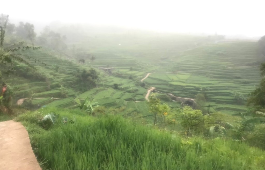 Di sekitar KM 9 saya melewati jalur yang cukup cantik. Yakni menuruni jalan sempit yang sekelilingnya terdapat area persawahan. Kala itu suasananya cukup berkabut. Waktu masih menunjukkan sekitar pukul 6.20.