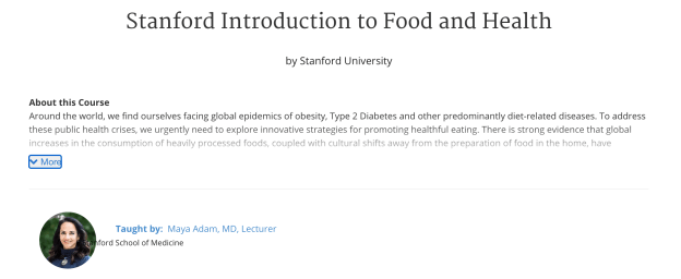 Saya baru saja menamatkan kelas “Stanford Introduction to Food and Health” di Coursera. Kelasnya cukup singkat, yakni hanya 4 minggu saja. Itu pun setiap minggunya kita hanya cukup meluangkan waktu sekitar 30-60 menit untuk menonton video dan mengerjakan kuis yang berjumlah 5 soal saja.