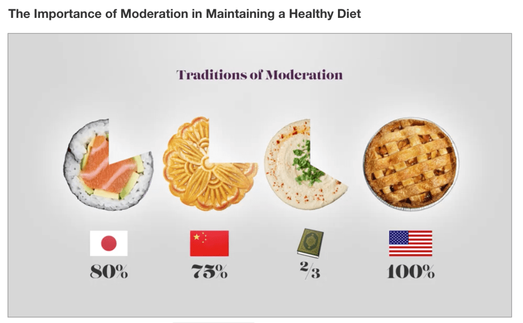 - Michael Pollan juga sempat menyebutkan tradisi di negara lain pandangan soal proporsi makanan yang dikonsumsi. Menariknya ia sempat mengutip Qur’an soal jangan makan makanan berlebihan ini. Hanya saja yang saya pahami Qur’an tidak menyebut angka definitif 2/3 ini. Setahu saya itu dari sabda Nabi Muhammad yang menyebutkan bahwa kapasitas perut kita ini 1/3 untuk makanan, 1/3 untuk air, dan 1/3 untuk udara. Mungkin 2/3 itu diambil dari hadits Nabi itu kali ya (untuk makanan dan air).