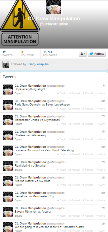 Setelah membaca twit-twit tersebut makin kuatlah dugaan orang-orang akan adanya manipulasi. Apalagi jika bukan karena twit-twit tersebut diketik 20 jam sebelum undian dilakukan. Bisa jadi sang pemilik akun ada koneksi ke dalam UEFA sehingga informasi tersebut bisa diperoleh.