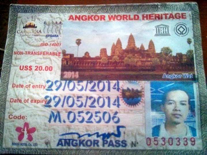 Untuk dapat memasuki candi-candi di kompleks Angkor Wat ini kita harus memiliki tiket yang disebut dengan Angkor Pass. Admission fee-nya sebesar USD 20. Tiket itu berlaku untuk one day tour di sana.