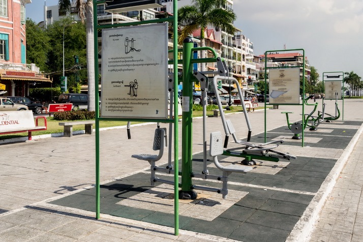 Riverside ini adalah taman kota Phnom Penh yang lokasinya berada di sisi sungai Mekong. Di sepanjang riverside ini terdapat bangku-bangku taman, area fitness, dan tiang-tiang bendera negara-negara di dunia. Aku cukup salut dengan pemerintah kota Phnom Penh ini. Terutama dengan fasilitas peralatan fitness yang mereka sediakan secara gratis di taman. Mengingatkanku pada taman kota di Reservoir Makau. Walaupun Kamboja termasuk negara berkembang, warganya hebat sekali bisa menjaga peralatan fitness ini agar tetap terawat.