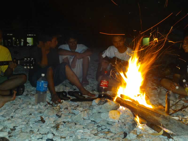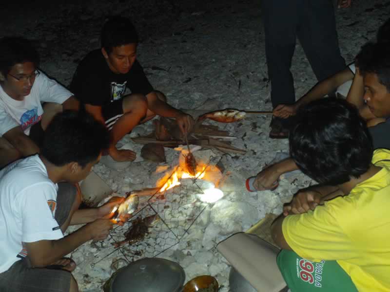 Cahaya api unggun pun menerangi malam yang gelap di pinggir pantai kala itu. Malam yang dingin pun turut terminimalisasi dengan panas yang dihasilkan api unggun tersebut. Begitu semua ikan selesai dibakar, kami langsung bersantap bebarengan dengan menu nasi plus lauk ikan bakar dan sambel jampang yang enak dan pedasnya bikin nagih. Nasi dan ikan bakar itu kami sajikan di atas gelaran kertas pangsit (kertas yang biasa digunakan untuk membungkus makanan) yang ditata secara memanjang laiknya meja makan. Masing-masing orang mengambil posisi di sepanjang gelaran tersebut menghadap ke arah makanan yang tersaji. Suasana makan malam saat itu benar-benar terasa guyub. Penuh dengan kesederhanaan dibalut dengan suasana kekeluargaan pula.