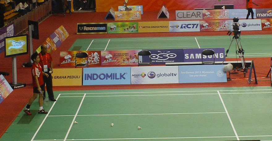 Pertandingan final bulutangkis SEA Games ini akan dimulai pukul 14.00. Pintu masuk stadion baru dibuka pukul sekitar pukul 13.15. Aku termasuk beruntung bisa berada di antrian yang agak awal sehingga ketika masuk ke dalam masih belum terlalu ramai sehingga masih bisa mendapatkan tempat yang cukup pewe untuk menyaksikan pertandingan walaupun bukan berada di deretan kursi paling depan.