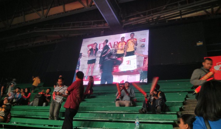 Tribun kelas satu yang kami masuki ternyata saat itu telah penuh dengan penonton. Kami pun sampai terpaksa menempati bangku di dekat giant screen. Tak disangka, di sana kami berjumpa dengan 3 orang adik angkatan kami di Informatika ITB, yakni angkatan 2010. Mereka kebetulan juga merupakan anggota Unit Bulutangkis ITB.