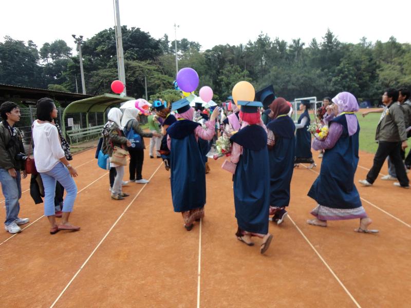 Tradisi itu berlanjut pada wisuda Juli 2011 ini. Jurusanku, Informatika, mendapatkan giliran pertama untuk melakukan arak-arakan (actually dapat giliran ketiga, tapi 2 fakultas sebelumnya, SBM & FSRD, tidak ikut arak-arakan atau melakukan arak-arakan di luar pakem yang sudah ditentukan, CMIIW). Mendapatkan urutan pertama ini ternyata memberikan berkah bagi kami. Arak-arakan berjalan lancar, tak banyak hambatan, tak perlu berhenti berkali-kali untuk menunggu arak-arakan himpunan di depan sebagaimana arak-arakan wisudaan sebelumnya.