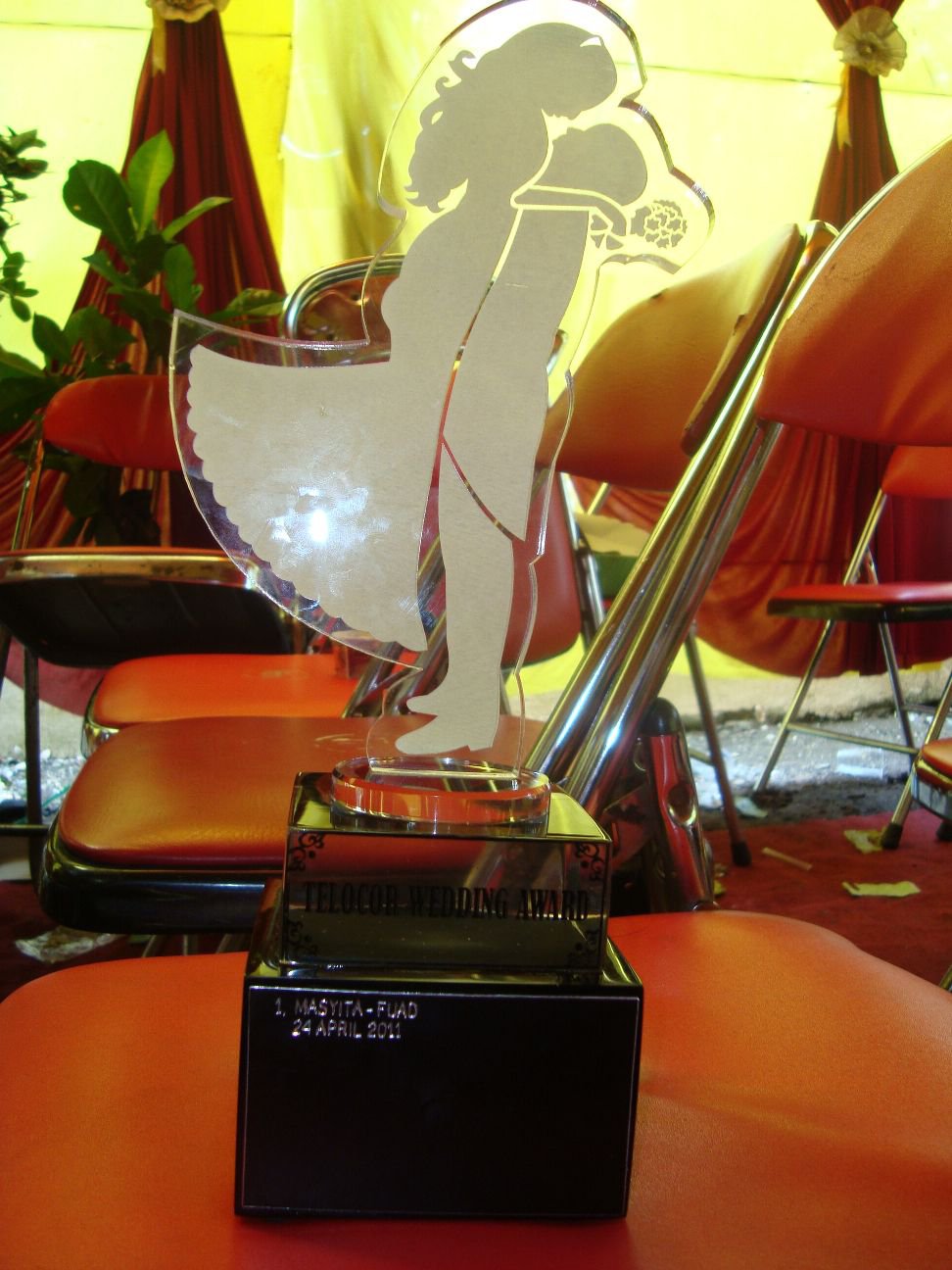 Selesai acara makan-makan, kami duduk-duduk dulu saling mengbrol satu sama lain sambil menunggu antrian untuk mengucapkan selamat kepada kedua mempelai dan foto bersama. Saat menunggu itu, tiba-tiba piala “Telocor Wedding Award” yang sudah kami persiapkan untuk Kak Syita terjatuh dan patah. Oh ya, sekedar pemberitahuan, piala ini sengaja kami buat bersama sebagai piala bergilir untuk diserahkan kepada warga telocor yang baru saja menikah dan diukir namanya di piala itu. Makanya, begitu piala itu patah, sempat terjadi kepanikan di antara kami. Akhirnya, diputuskan untuk menyambungnya dengan lem alteco yang dibeli di toko dekat tempat resepsi. Hahaha, untung saja.