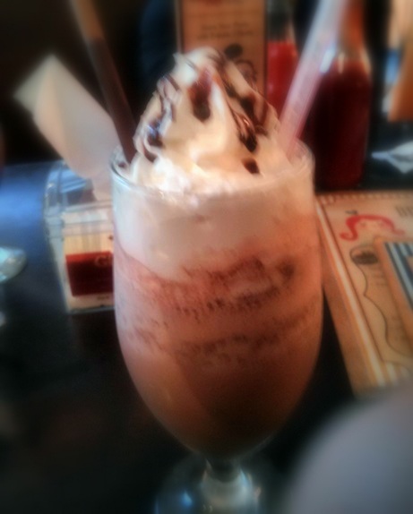 Untuk minumannya aku memilih Chocolagio, es coklat dengan krim bertabur meses ceres dan ada semacam remah-remah Oreo-nya.